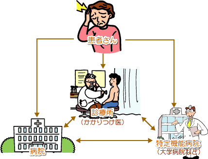 | 患者さんは病気になると診療所もしくは病院にかかります。診療所は入院設備がありませんので入院が必要な場合とか専門外で病態が重篤なため集中管理が必要な時や高額医療機器の検査が必要な時に病院に紹介されます。病院では必要な検査や診断・治療がなされ、安定期になれば退院し、また診療所で継続医療がなされます。病態が重篤な場合は引き続き病院で診ることもあります。 そしてまた発作が起きたときに病院に紹介され治療を受けます。こういった縮図の医療が円滑になされるのが、良い病診連携の関係といえます。 そのために次のような事業を行ったり、協力体制をしております。
